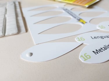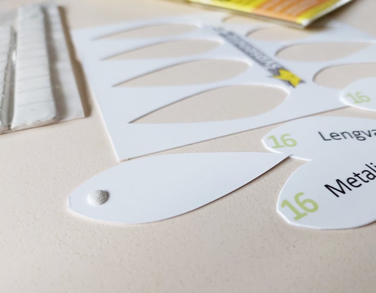 Paimkime vieną iš lapukų laikiklių. Išskaidykime lapelius. Ant blogosios pusės priklijuokime lipniosios gumos gabalėlį.